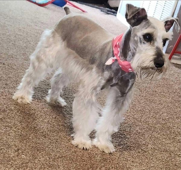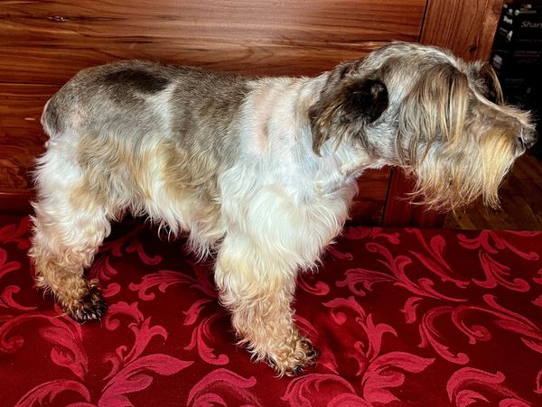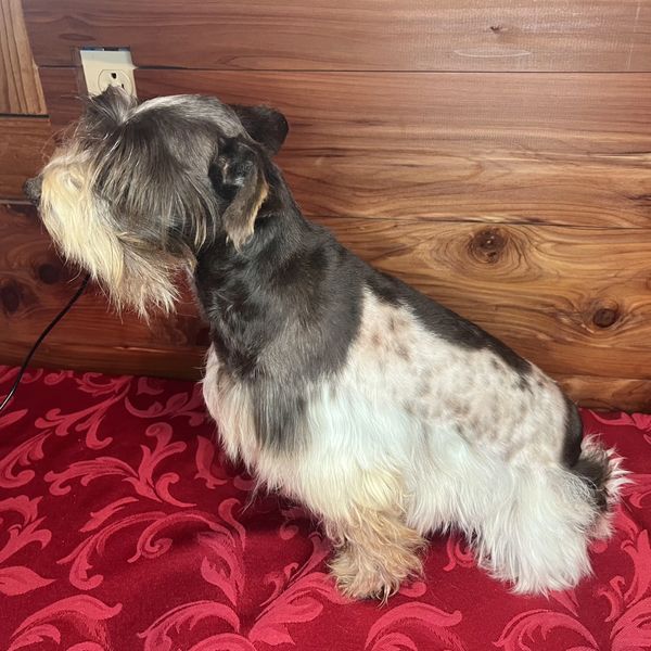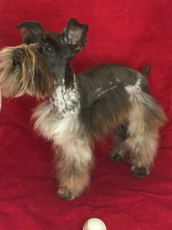 Della is an AKC registeted Liver and White Parti Schnauzer. She is very square and stocky with the perfect Schnauzer build . Della is approximately 11 inches tall.
