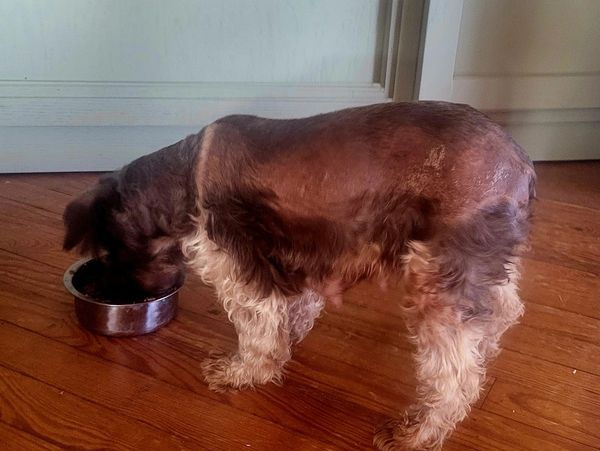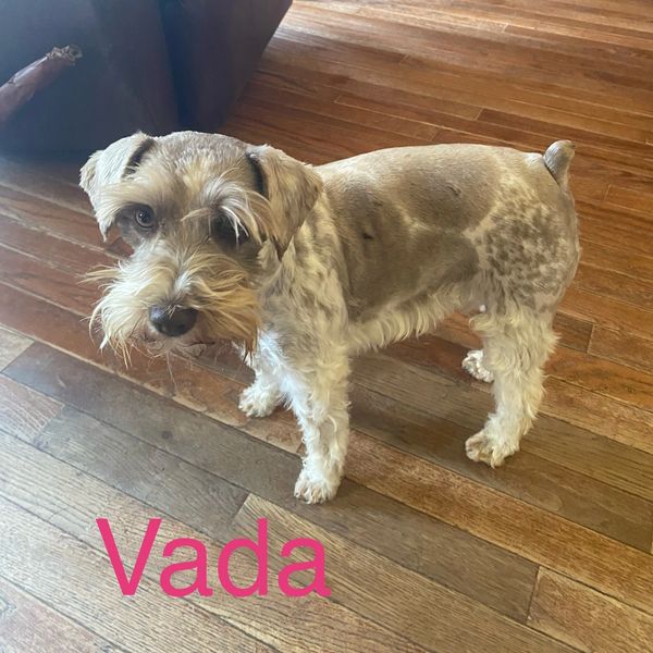 Vada is an AKC registered Liver Parti Schnauzer. She is approximately 11 inches tall at the shoulder.