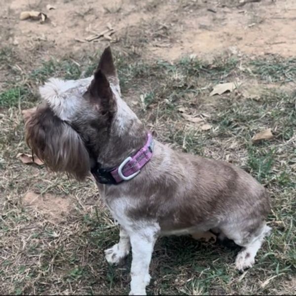 Bandit is a registered AKC liver parti with heavy ticking Schnauzer. He is a playful and loving little guy with a great personality. Bandit measures approximately 10 inches tall at the shoulder.
